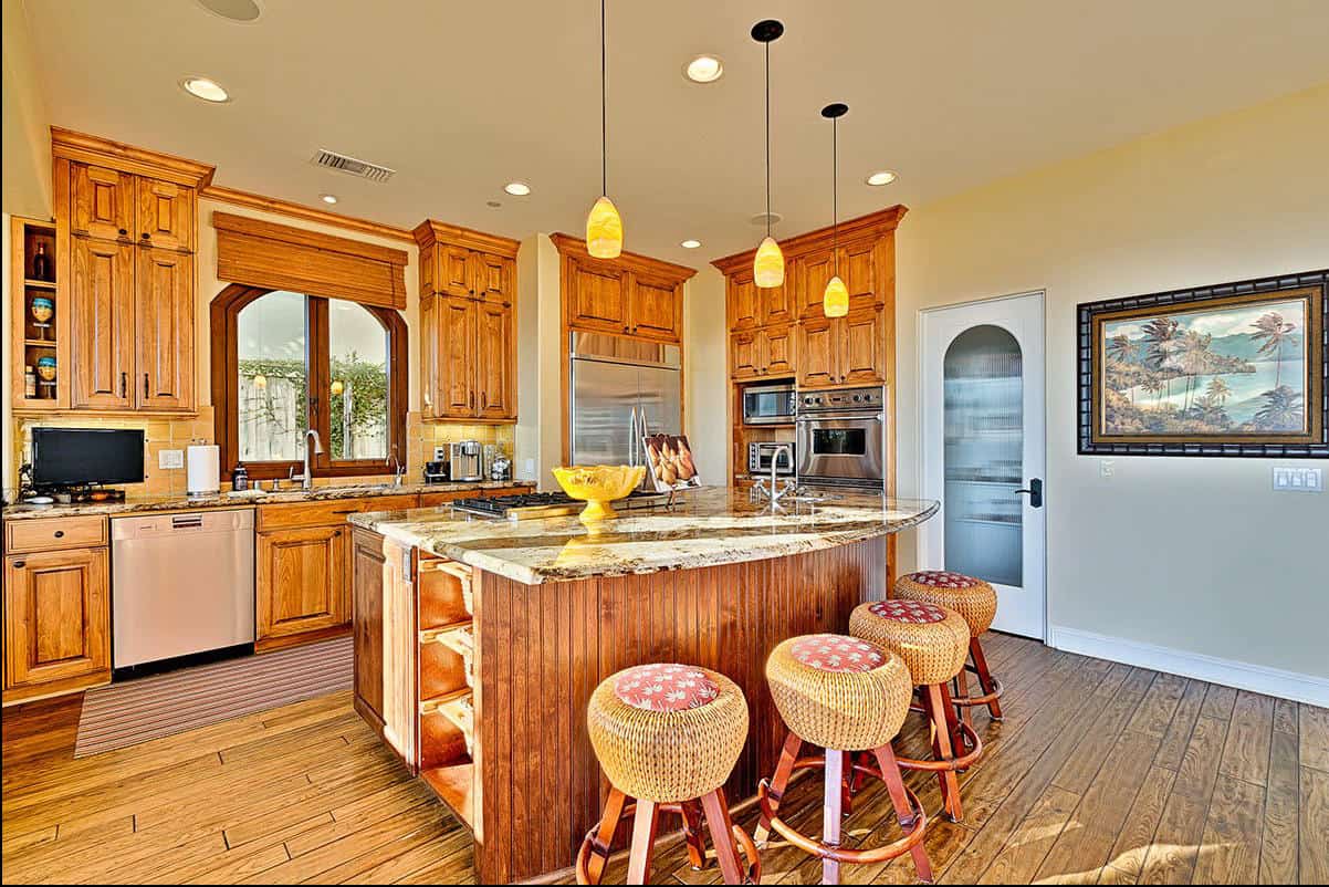 On one side of the house, formal living and dining areas recall Italian mansions with double-height ceilings, sweeping staircases with wrought-iron railings, and a stately stone fireplace. On the other, the open-plan TV room and kitchen get a more relaxed vibe from a fold-away glass wall overlooking the patio and ocean and painted surfboards on the wall. The fully equipped kitchen has both a breakfast bar and a cozy breakfast banquette.