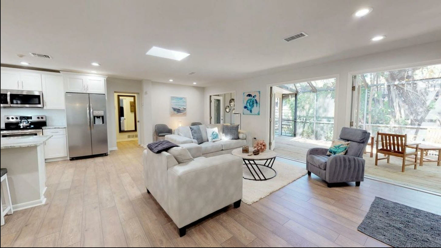 Sit out on our huge screened-in patio with a cup of your favorite coffee or your favorite adult beverage and enjoy the quiet rustling of water in our heated, salt-water pool, read a great book, or prepare alfresco dining. This 1960s ranch home has been completely remolded to reflect today’s modern décor, including all new stainless steel appliances, a remodeled kitchen, and remodeled bathrooms.